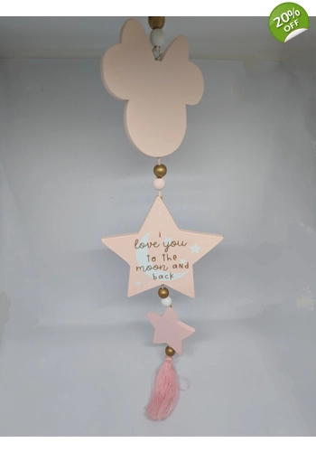 Love Disney hanging plaque featuring minnie mouse , it says Love You To The Moon And Back and minnies head and a star then a tassle and bead truly a lovely hanging plaque suitable for a nursery or childs bedroom , also make a lovely gift take a look at our otber co ordinatinv items !